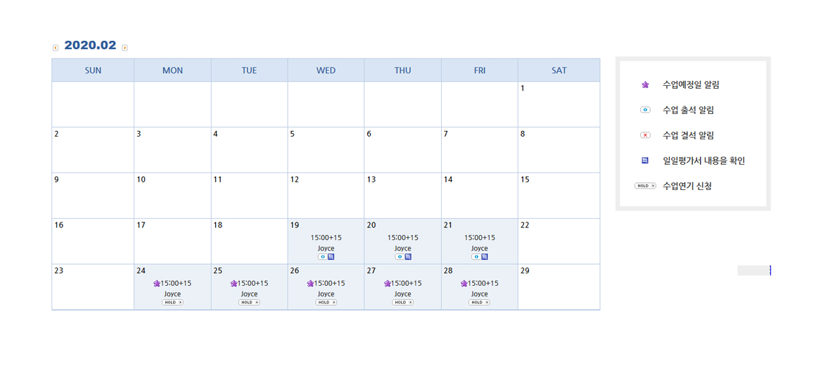 수업일, 출/결석 여부, 일일평가서를 확인할 수 있으며 또한 수업하루 전까지 수업 홀드를 신청할 수 있습니다.